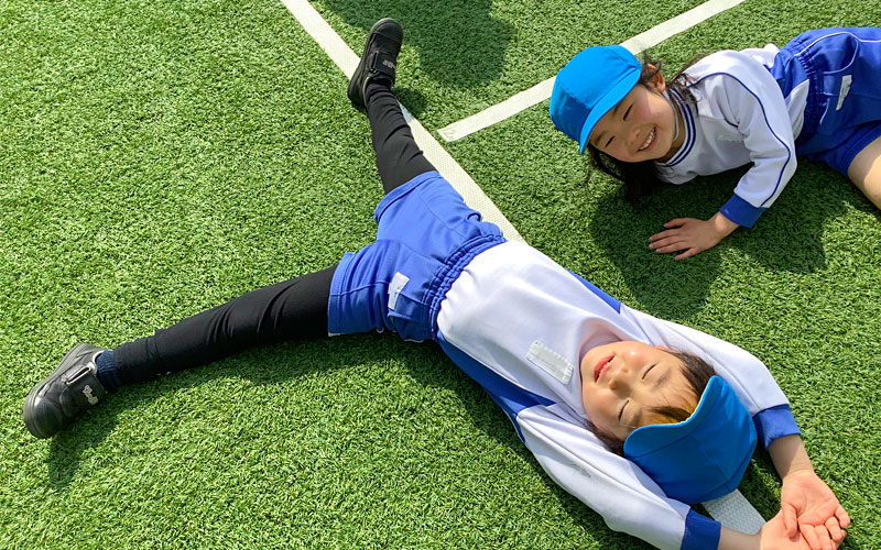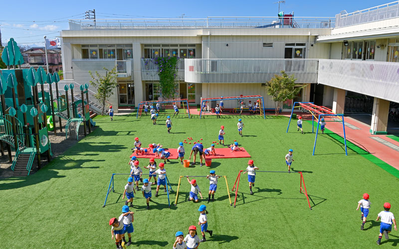 幼稚園の園庭は、園児の安全と運動機能向上を目的として全面エコターフになっております。